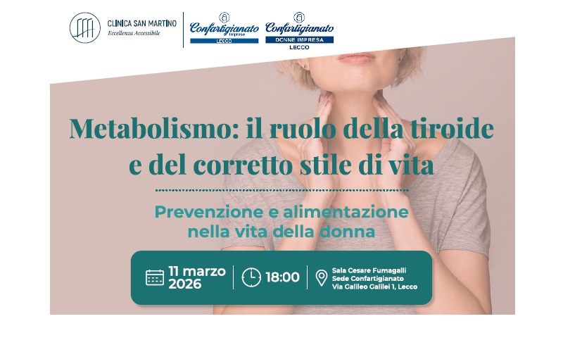 In occasione della Giornata internazionale della Donna, il Movimento Donne Impresa di Confartigianato Imprese Lecco organizza l'incontro GRATUITO e APERTO A TUTTE "METABOLISMO: IL RUOLO DELLA TIROIDE E DEL CORRETTO STILE DI VITA" PREVENZIONE E ALIMENTAZIONE NELLA VITA DELLA DONNA. L'incontro si terrà mercoledì 11 marzo 2026 presso la Sala convegni “Cesare Fumagalli” in Confartigianato Imprese Lecco, via Galilei, 1 (Lecco) dalle h.18:00 alle h. 20:00. Le dott.sse Elisabetta Mainetti, endocrinologa, e Maria Rosa Barreca, nutrizionista, della Clinica San Martino di Malgrate guideranno alla comprensione del metabolismo, aiutando le presenti a riconoscere i segnali da non ignorare e proponendo strategie concrete per ritrovare energia, migliorare il sonno e innalzare la qualità della vita.